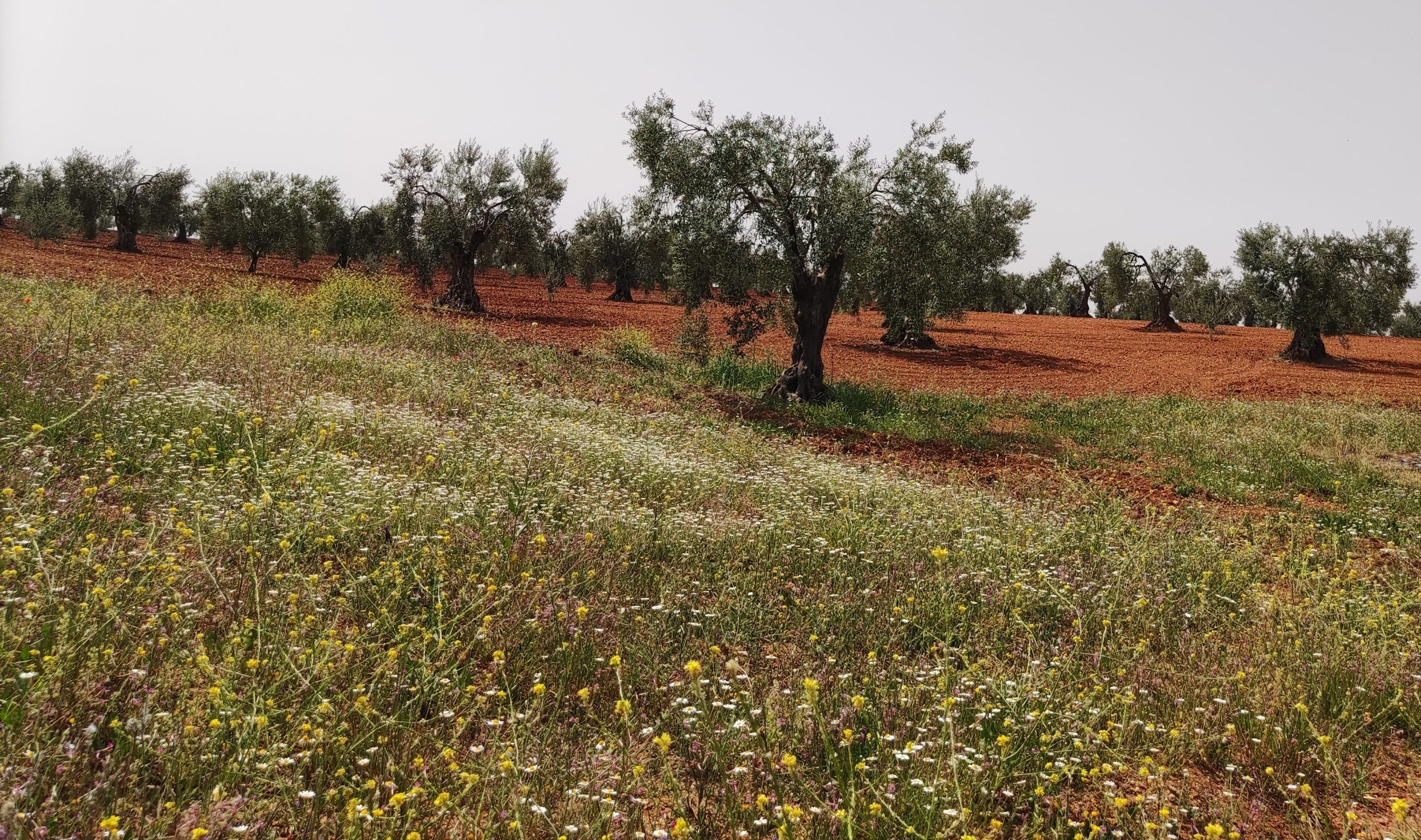 Por nuestro clima y el peligro de incendios no podemos hacer cubiertas naturales completas, debiendo desbrozarse cuando la vegetación se agosta, sirviendo de abono y compostaje que las raíces de toda esta flora utilizarán para estructurar el suelo con la ayuda de multitud de microorganismos naturales que fijarán nutrientes y humedad que podrán aprovechar nuestros olivos durante los duros meses de verano.