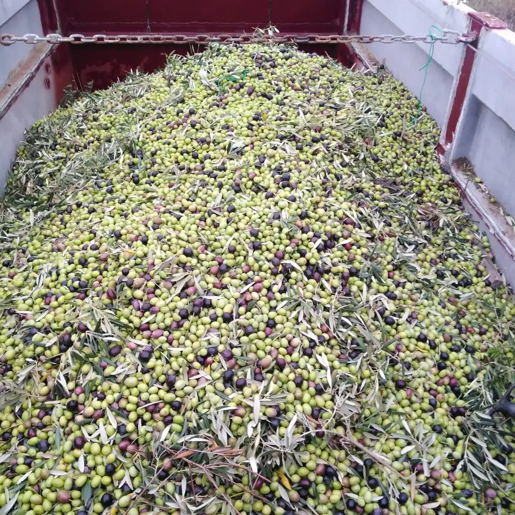Os ponemos una foto de uno de los remolques de picual que hemos utilizado para mezclar con carrasqueña y donde se ve la calidad excepcional del fruto y la diferencia de maduración entre las distintas variedades.
