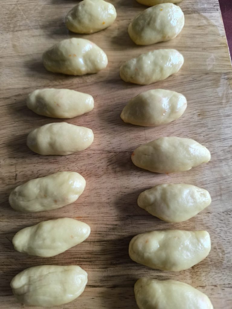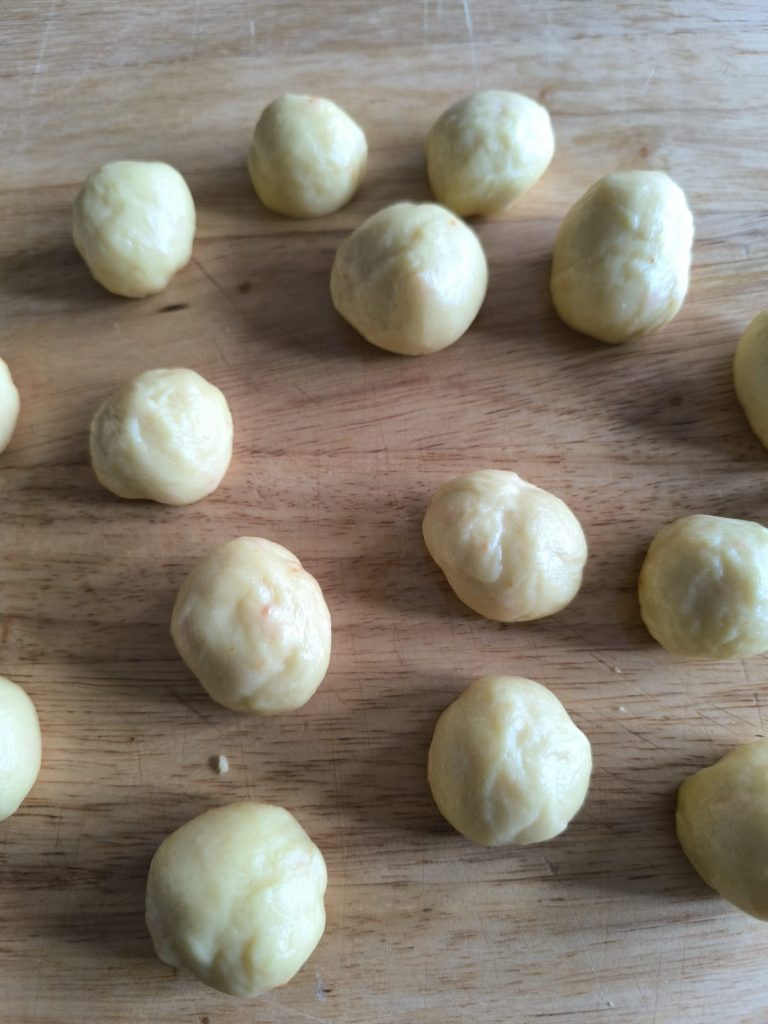 Forma las orejas cogiendo pequeñas porciones de masa (tamaño nuez) y forma bolitas. Para que no se te pegue a las manos humedécelas con aceite y el rodillo también.