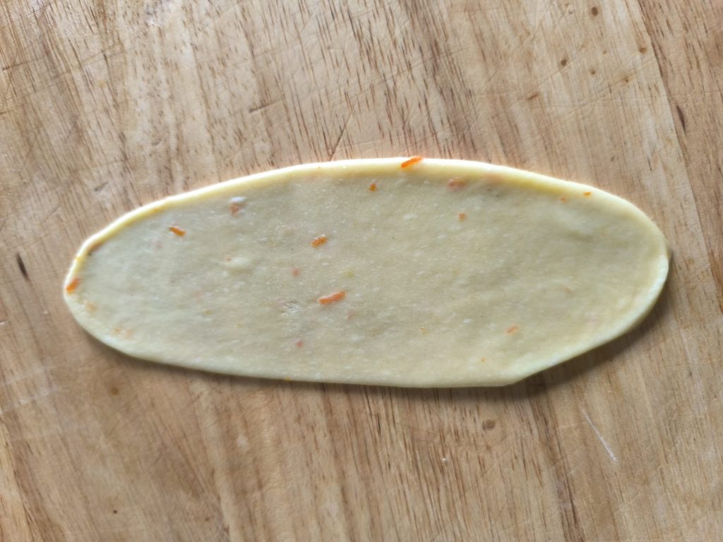 Estira cada bolita en forma de croqueta y con un rodillo dale una forma alargada, irregular y superfina (similar a una oreja).