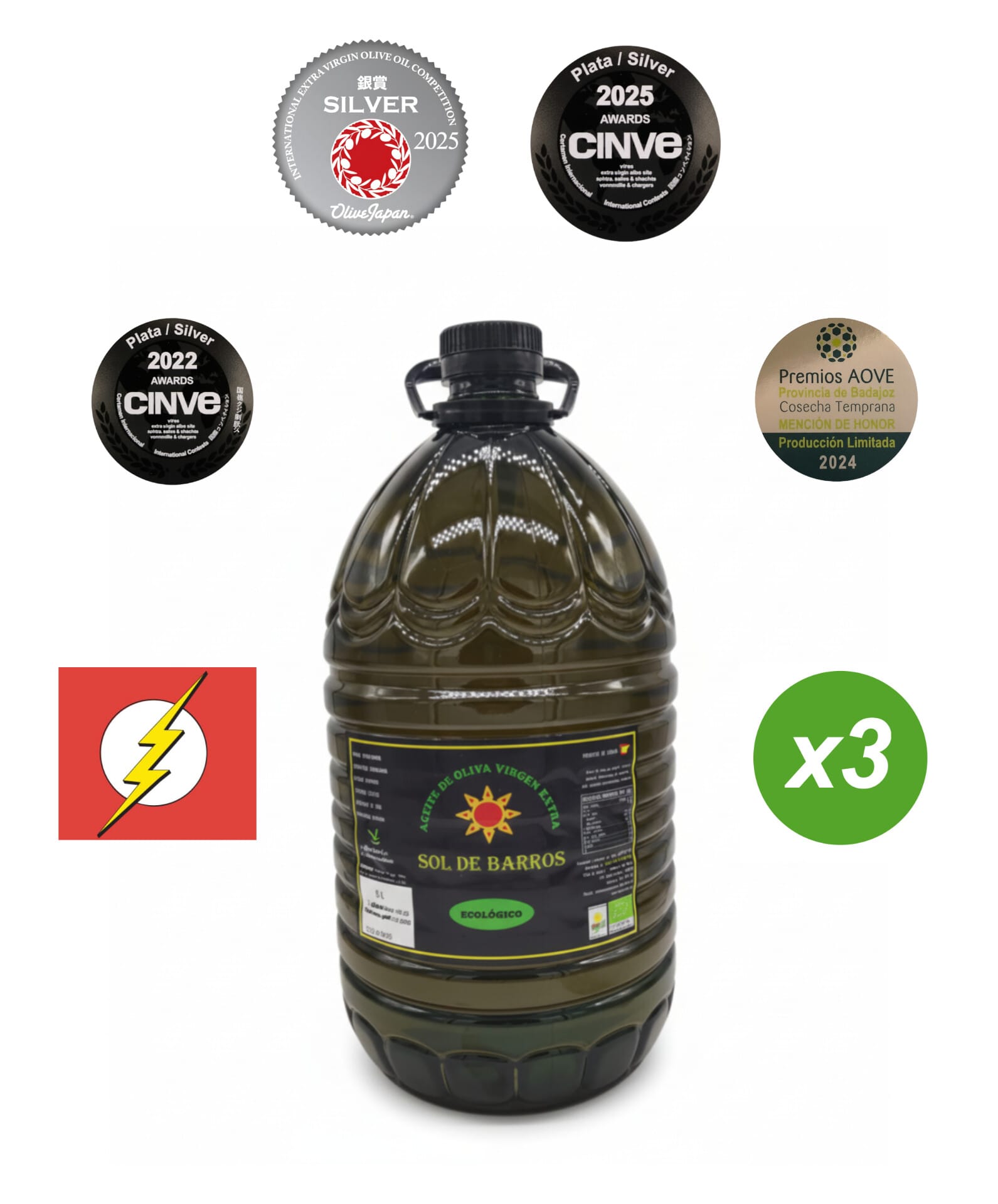 Oferta 5º Aniversario de Aceite de oliva virgen extra ecológico en garrafas de 5 litros, aceite de autor de Extremadura, Coupage “5 Oros” SOL DE BARROS, de calidad premium gourmet y cosecha temprana; extraído en frío, puro zumo natural de las mejores aceitunas seleccionadas de nuestro olivar tradicional (Picual, Carrasqueña-Manzanilla, Morisca, Pico-limón y Verdial de Badajoz)