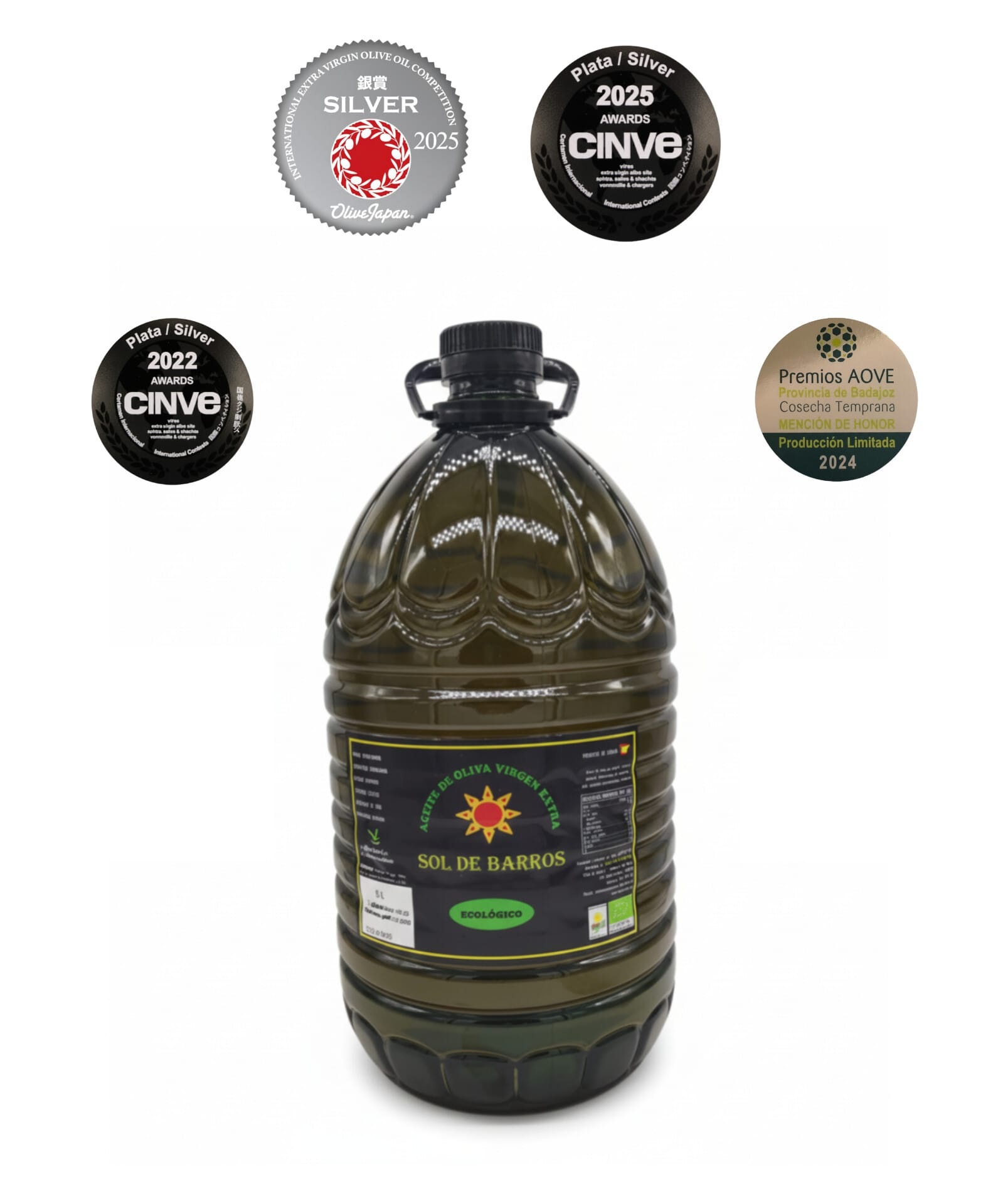 2024: Mención de Honor a los mejores AOVE de producción limitada en la “VIII edición de la Cata-Concurso de Aceites de Oliva Virgen Extra Provincia de Badajoz Cosecha Temprana 2024-2025” para nuestro AOVE ecológico SOL DE BARROS Coupage «5 Oros».